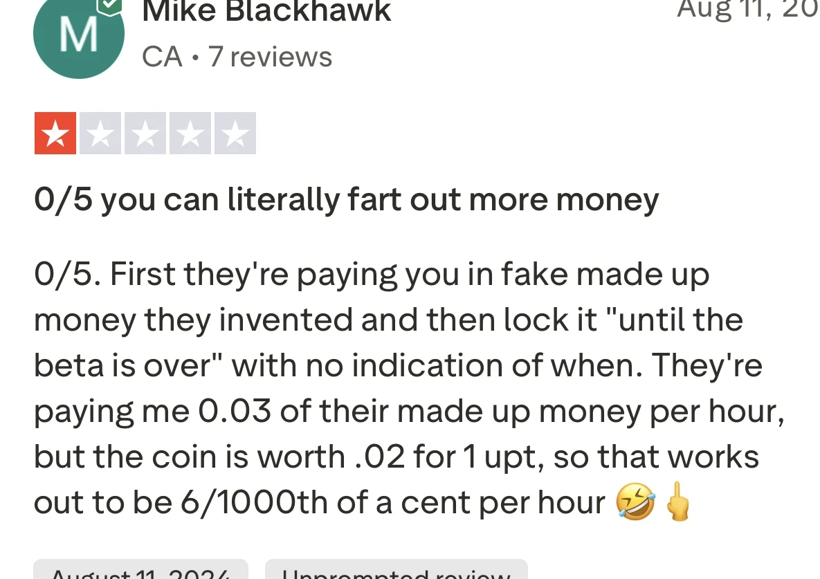 “ They’re paying me 0.03 of their made-up money per hour, but the coin is worth .02 for 1 upt, so that works out to be 6/1000th of a cent per hour 🖕 “
